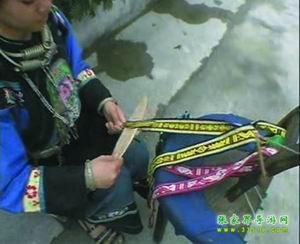苗家花帶,織花帶,是苗家姑娘最盛行最喜愛的一種習(xí)俗。在苗家,從女兒長到七八歲起,母親就要叫他做針線活,待到十歲左右就交他學(xué)織花帶,如果母親技藝不高,還要請(qǐng)寨子里花帶技術(shù)最高的婦女來教。又得女孩子,從母親或姐姐那里初步學(xué)到織花帶技術(shù)后,就在本寨子邀同齡伙伴,三五個(gè)在一起,互相切磋技藝。待到編制技術(shù)日趨成熟后,姑娘也大了,就往往一個(gè)人躲在房中編制出色鮮艷的花帶,風(fēng)險(xiǎn)少女的情愛。苗家姑娘,往往拿自己編制的花帶作為禮品相贈(zèng),特別是姑娘有了意中人,就吧花帶作為愛情的信物相贈(zèng),以表示以身相許,愛情純貞。