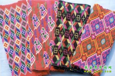 ![]() 織錦。又名“西蘭卡普”、“土花鋪蓋”,為土家族傳統(tǒng)工藝品之一,是森林公園工藝品廠的主要產(chǎn)品。織錦是在特制的本質(zhì)織機(jī)上以錦紗為經(jīng)、五彩絲線為緯、手工提花織成。以其質(zhì)地厚實(shí)、堅(jiān)韌,色彩鮮艷,格調(diào)古樸,流暢生動著稱。圖案有花草、鳥獸、生產(chǎn)、生活、幾何、字樣等種類。為舊時(shí)土家姑娘必備嫁妝之一。據(jù)考證,早在漢代,土家織錦就作為方物貢入漢室宮廷。20世紀(jì)后,土家織錦曾漂洋過海至日、美、英等國展出,并作為禮品,被國家領(lǐng)導(dǎo)人贈送給外國元首及政府官員,如今織錦以壁掛、枕巾、沙發(fā)墊、桌圍、提袋、服飾等多種式樣遠(yuǎn)銷世界各地。