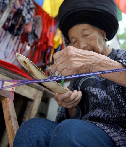 織花帶,據(jù)有關史書記載:“南蠻斷發(fā)紋身,以示與龍蛇同類,免其傷害。”原來,苗家姑娘織花帶是為了防蛇傷身,所織花帶以假亂真,其花紋形同蛇樣,使蛇誤認為是同類,使人不受其害。怪不得本書作者在苗家做客時,曾聽到一個美好的傳說:在古代,因居住在苗嶺山區(qū)的人經(jīng)常遭受毒蛇的傷害,便有一個美麗聰明的姑娘想出了一個辦法,她見蛇遇同類便迅速離開,就仿照蛇的花紋編織了約一寸寬的一種花帶。這種花帶平時上山纏在身上,如遇毒蛇就取下花帶對蛇一擺弄,這樣毒蛇見了以為是同類,便迅速離開了。這個辦法很靈,使許多苗家人免受了傷害。自那以后,苗族織花帶也就一代一代傳下來了。苗族花帶經(jīng)代代相傳,越織越快,越織越美,它由原來單一的為了防止蛇傷發(fā)展到現(xiàn)在的多種用途,如作為青年戀愛的信物,饋贈親友的禮品,也用于提包的背帶和一部分家具的裝飾等等。花帶的圖案紋樣也越來越豐富了,有表現(xiàn)吉祥與愛情生活的,如《雙喜臨門》、《五谷豐登》、《鴛鴦戲水》等,也有表現(xiàn)花卉的,如《秋菊》、《蘭草》等等。苗族姑娘編織花帶的工藝也有進步,以前織一根花帶,要幾天,現(xiàn)在,只見她們手拿一根牛骨針(也有用銅針與銀針的),如流星閃爍一般,揮針走線,一根一米長的花帶很快就織成了。 苗族同胞特別好客,他們很講禮貌,重感情、守諾言,待人誠懇、憨厚樸實,不虛偽。他們歷來主持正義,扶正斥邪,路見不平,撥刀相助、赴湯蹈火,在所不辭。