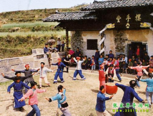 “擺手”,土家人稱為“社巴”,正月初三至十七日這段時間稱為“社巴日”或“社巴節(jié)”,歷史上,土家人在各村寨都建有“擺手堂”和神廟。在神廟內(nèi),還供有土家族的祖先八部大王或土司王神像.每到“社巴節(jié)日”都有歌舞活動。這種調(diào)年擺手舞叫“社巴”也有叫“調(diào)年”的,有強烈的戲劇性,有故事情節(jié),還有人物,它由拔普(公公)、拔帕(婆婆)、阿達與阿柯等男女老少集體在而舞。 擺手舞的形式一般是這樣的:在擺手堂的中央高掛龍旗,四方點燈,由金童玉女給土家人用銅盆洗手,再從香火山取來神火,然后在龍旗下點燃3堆篝火。隨著3聲炮響,先由梯碼法師(巫師)手舉八寶銅鈴作前導,大家跟著翩翩起舞,徹夜不眠。 擺手舞的主要動作在走路與彎腰時,擺動同邊手。擺的形式,一般分單擺、雙擺、環(huán)擺、花擺、插擺與擺七步等,因為擺得多,所以稱“擺手舞”。擺手舞,還分“小擺手”與“大擺手”。“小擺手”的規(guī)模的較小,形式與內(nèi)容主要是模擬挖地、播種、薅包谷草、摘包谷或者是在田里插秧、扮谷、曬谷等多項農(nóng)事活動,也有表現(xiàn)打獵或漁獵活動的。有些地方的“小擺手”舞也有表現(xiàn)吹木葉、接新娘等生活內(nèi)容的。 “大擺手”,主要是規(guī)模大,參加的單位往往是幾個甚至幾十個村寨,參加的人數(shù)也幾千人或上萬甚于幾十萬人的。“大擺手”的內(nèi)容比“小擺手”豐富,除表現(xiàn)農(nóng)事活動和土家人生活以外,還有表現(xiàn)軍事活動的。“大擺手”的形式,一般先由領頭人手執(zhí)五彩布條做的“柳巾”指揮,接著是“梯碼”隊(由巫師組成)和鼓樂隊,同時,男女擺手舞隊也一起入場。這其中還有特別引人注目的披甲小旗隊(他們身披打花鋪蓋象征盔甲)。這支披甲小旗隊手執(zhí)小花旗,顏色有紅有綠,有黃有藍,色彩艷麗,五彩繽紛。他們表演的內(nèi)容與形式,主要是反映人類起源,先民軍事活動、部落搬遷等,舞蹈動作難度較大,為廣大土家人所喜愛。