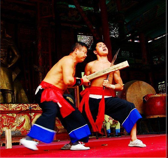 大庸氣功 大庸氣,堪稱武林奇葩,曾為祖國贏得聲譽,海內(nèi)外享有極主名望。 大庸氣功是大庸各民族特別是土家族傳統(tǒng)體育項 目之了,分健體氣派、武術(shù)氣功兩類。前者有“返還 功”、“馬王推氣功”、“少林達摩醫(yī)療保健氣功” 等;后者有靜坐、壁虎、靈子、二指彈、碎石、松靜 、硬氣、五禽、五陽功等,尤以硬氣功著稱。大庸硬 氣功,歷史悠久,漢代相單程,明代覃后,清代劉明 燈,當代湯子模、周鐵鞭、杜心武、趙繼書等都具有 超人硬氣武功。大庸土著民族在漫長的反征服、反壓 迫斗爭,博采武當、少林南北派、昆侖派眾家武林精 華,創(chuàng)造出獨此一家的大庸硬氣功。 據(jù)傳,大庸硬氣功鼻祖是楚國鬼谷子?!?a class="insidelink" href="http://m.nuob.net/cityinfo/15580531721.html" title="永定區(qū)">永定縣 志》有關(guān)鬼谷子隱居天門山鬼谷洞潛心學(xué)《易》、傳 授方術(shù)的記載。到清代有武林高手朱茂嶺,隱居三岔 村北芭蕉灣洞,研究鬼谷氣功之術(shù),后收西溪坪胡口 子、余世萬(即“余通人”)為徙,傳其衣缽。余通 人將武術(shù)氣功系統(tǒng)整理,發(fā)揚光大,播名于世。 新中國成立后,黨和政府十分重視民間氣功發(fā)掘 整理,并正式列為體育項目加以普及發(fā)展,今日大庸 市習(xí)練硬氣功達數(shù)萬人眾。永定區(qū)官黎坪村世有“硬 氣功之鄉(xiāng)”盛譽,該村男女老幼,練功已蔚成風氣, 其武師趙繼書,1979年先后參加全省和全國武術(shù)大賽 ,均獲一等獎,受到國家體委重視,同年7 月趙繼書 專程到北京給中央領(lǐng)導(dǎo)同志匯報表演。嗣后,隨同中 國武術(shù)代表團和國家領(lǐng)導(dǎo)人先后兩次出國,到盧森堡 、意大利、比利時、羅馬尼亞、馬其他和東南亞等國 家訪問。他表演的臥刀碎石、頭頂開石、雙鳳灌耳、 頭碰石柱、叉尖推磨等精彩節(jié)目,博得外國友人好評 。盧森堡一位榮獲國家獎牌的武士,看了表演后連夜 來到中國大使館,將自己珍藏多年的獎牌贈送給他; 盧森堡國王主動熱情走上臺與趙繼書熱情擁抱,連連 稱贊:“了不起!了不起!國際氣功大師!”并把珍 藏紀念章一枚贈送給趙繼書。一位法國朋友十分贊賞 說:“中國的氣功,稱為全人類的寶貴財富,是有科 學(xué)道理的。”自此,大庸硬氣功譽滿全球。湖南瀟湘 電影制片廠專門拍攝了彩色紀錄片《大庸氣功》。 大庸硬氣功共有二十多個項目,最有影響的是: 腹臥鋼叉 由二人在地面扶住一根叉尖朝上的三 股鋼叉,叉尖猁鋒利,然后一個俯身叉尖,尖抵腹部 ,待其四肢平展懸空,扶叉二人轉(zhuǎn)動鋼叉,謂之推磨 。表演時,要求臥叉者運氣于腹,氣意集中,稍有大 意,叉即穿腹而過。 臥刀破石 先固定兩把大刀,刀口朝上,臥刀者 運氣后,由其他人抬臥于刀口上(有仰臥、俯臥兩種) ,然后在臥刀者腹部或背部置一碩大石條(約數(shù)百斤) ,一人或兩人輪大鐵錘狠擊石條直至斷裂破碎為止。 釘?shù)洞财剖?地上倒一層碎玻璃片,一人仰臥其 上;然后腹上置釘床,又一人仰臥釘床上,再于第二 人腹上置釘床,第三人仰臥刀床上,腹部上壓一塊數(shù) 百斤大條石,由人掄錘狠砸,至石破為止。 銀槍刺喉 用一根兩頭安有鋒利槍頭的鋼槍,抵 置兩位表演者喉部,然后相對發(fā)力,至槍桿抵成彎弓 形而喉部安然無恙。 徙手斷石 表演者將堅滑如鐵一塊卵石置于石凳 (地)上,然后運氣于掌或指擊斷(碎)卵石。 踢腿斬石 表演者運氣于腿,以腿踢斷石條。一 般可踢斷15公分以上厚度的麻石條或青石條。 胸部打刀 將鋒利大刀刃口置于胸部肌肉上,用 一根拳頭粗木棒猛擊刀背,至棒斷而胸部無傷。 新中國成立以來,大庸民間武術(shù)與民族體育逐漸 融為一體,發(fā)揮著提高人民身體素質(zhì)、弘揚中華武術(shù) 傳統(tǒng)和增進國際友誼重大作用。除硬氣功外,還有數(shù) 十種武術(shù)形式散見于民間武術(shù)體育活動之中。如打飛 棒、扭扁擔、抵搭斗杠、擠油渣、甩抱腰、舉石鎖、 板牛角(一種斗牛形式)等等。其特點是因地制宜, 不分場地,凡田園地角院壩集鎮(zhèn),都是習(xí)武練功、開 展活動的處所,頗具泥土氣息。擬或以生活中某些動 作和動物的某種形態(tài),稍加模仿演繹,便成某一獨特 武術(shù)形式。如天門武術(shù)功夫大師余道人所創(chuàng)造的“宮 天梳”、“巖燕樸天門”等;也有就地理特點創(chuàng)造某 種武功形式的,如“蕩藤”等。 以上部分圖片均來自互聯(lián)網(wǎng),出處不詳,請作者與本站聯(lián)系。 |