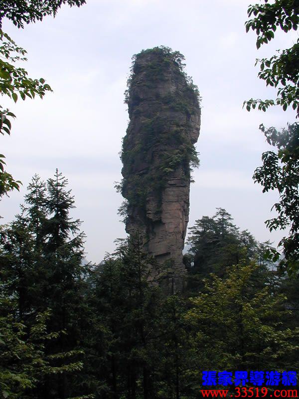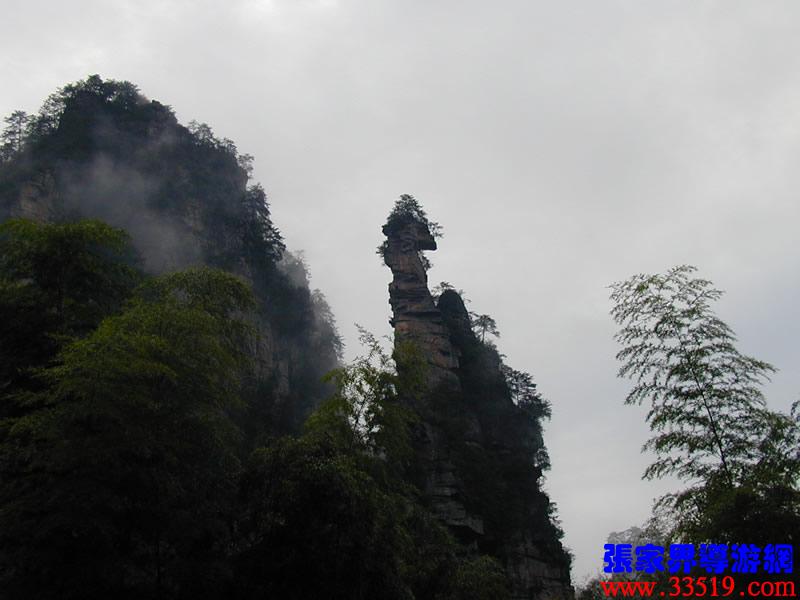 (南天一柱)現(xiàn)在我們前方幽谷峰林中有一高達(dá)200多米的孤峰,宛如擎天玉柱。上部灌木點(diǎn)綴,中部巖身赤裸,下部樹(shù)木遮掩,峰體渾圓、偉岸,因立南天門(mén)下而得名?!?/p>