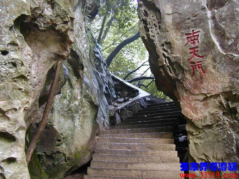 (南天門(mén))(前行20米)現(xiàn)請(qǐng)大家抑頭望,可見(jiàn)一洞門(mén),此門(mén)高約30米、寬4米左右,由游道兩側(cè)的兩座石峰斜傾拱峙而成。門(mén)右邊不遠(yuǎn)處一峰高約20米,峰頂如人頭,有臉有面,似把門(mén)將軍。