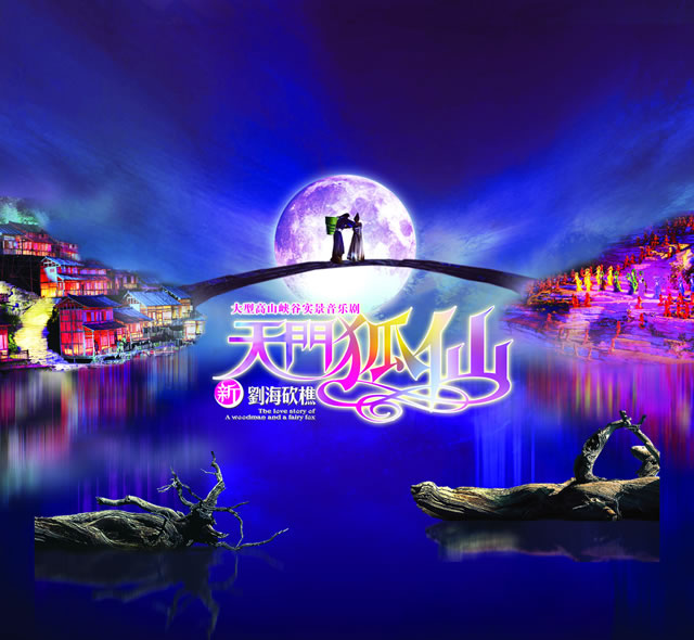 《天門狐仙——新劉海砍樵》目前是世界第一臺有完整故事情節(jié)的山水實景音樂歌舞劇。舞臺選址在天門山風(fēng)景區(qū)山門口內(nèi)至天門山頂?shù)恼麠l峽谷,總投資達(dá)到1.2億元,演員隊伍達(dá)530多人。主舞臺以10000平米的玻璃鋼打造,是目前世界最大的全景玻璃鋼舞臺。音樂主創(chuàng):譚盾。