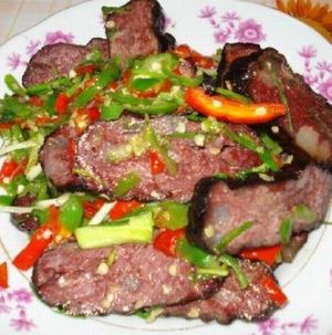 名稱: 血豆腐 介紹: 血豆腐,就是將豆腐和豬血、豬肉及花椒、辣椒等佐料拌成泥狀,捋成卵形,以竹篩置火炕上,煙熏烤成臘黃,吃起來耐嚼味香,是土家特色菜,當(dāng)?shù)厝顺R云湎戮啤?在張家界的飯館里很難吃到正宗的土家特色菜,可以去做土味的特色餐館去解解饞。但是最正宗還是鄉(xiāng)下人家家里自己熏的,那才叫一個好吃?。。?/p>