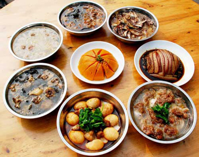 如果說靖港的吃名聞遐邇,有口皆碑,那么,八大碗則是靖港吃之翹楚,也是古鎮(zhèn)人引以為榮的傳統(tǒng)名牌。從前靖港街上數(shù)十家有名餐館,都把八大碗當作各自的招牌菜,各餐館的廚師也都是潛心研習,精益求精,把烹制出高水平的八大碗當作看家本領(lǐng)。曾經(jīng)繁榮昌盛的“小漢口”靖港,那些停船上岸的船夫,載貨而來的生意人以及慕名而來的浪人,首先就得進餐館吃八大碗,飽其饞吻,享其口福,乃至為了貪吃八大碗而“船到靖港口,順風也不走。”而靖港街上的紅白喜事,也是非八大碗不成宴席。