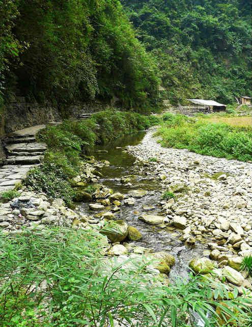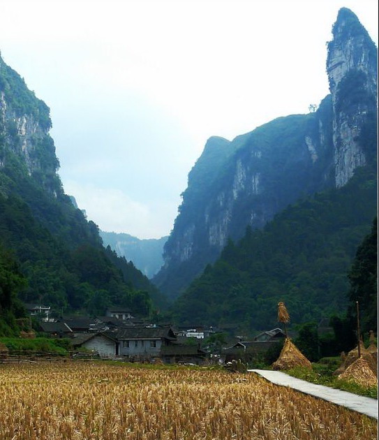 村寨四周山勢雄奇,絕壁夾天;“夯峽”、“九龍”、“玉泉”三溪在這里相會,如同三根彩帶在這里相交結(jié)。這里是風(fēng)景區(qū)的中心,一萬五千多米長的青石板路從這里一直通向各個(gè)景點(diǎn)這里還是一個(gè)角度十分好的觀景臺,人立于此,只要原地轉(zhuǎn)動(dòng)身子,就可觀賞到東西南北全方位的各個(gè)景點(diǎn),那含情脈脈的“相依巖”、昂首奮蹄的“駟馬峰”、惟妙惟肖的“孔雀開屏”五彩繽紛的“彩云壁”和“畫屏峰”……盡在眼中無不景象萬千,令人目不瑕接。詩人石元機(jī)贊曰: