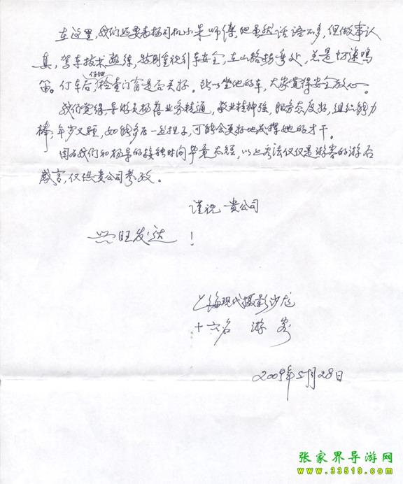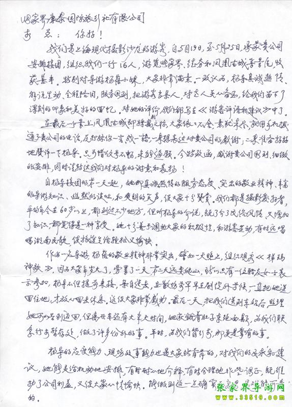2009年5月19日“上海現(xiàn)代攝影沙龍”一行16人,參加張家界旅游導(dǎo)游網(wǎng)組織的張家界旅游跟團(tuán),于2009年5月25日結(jié)束行程。游玩期間,由于導(dǎo)游楊蓓的出色講解和周到的服務(wù),得到客人的一致好評(píng)??腿颂丶谋頁P(yáng)信一封,如下: