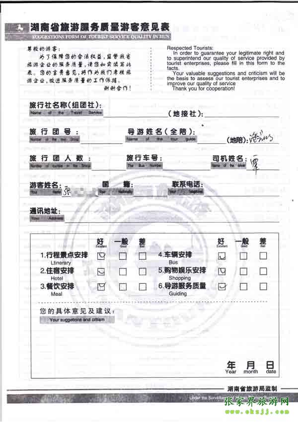 2010年10月13日張先生旅游質(zhì)量反饋