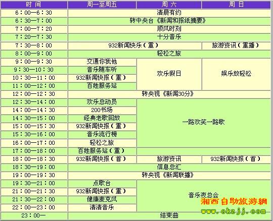 張家界旅游交通頻道茲定于四月八號(hào)試播,頻率為FM93.2兆赫和103.2兆赫。頻道以立足旅游交通、服務(wù)百姓大眾為宗旨,設(shè)置了《清晨有約》、《順風(fēng)時(shí)刻》、《932新聞快報(bào)》、《輕松之旅》、《交通你我他》、《百姓服務(wù)站》、《歡樂總動(dòng)員》和《音樂隨車聽》等欄目。屆時(shí),聽眾可以通過熱線電話、短信平臺(tái)以及網(wǎng)絡(luò)廣播等多種途徑參與到電臺(tái)節(jié)目中來,在第一時(shí)間了解新聞動(dòng)態(tài),掌握市場信息,享受娛樂休閑。 直播熱線:0744——2116999 熱線電話:0744——2116777 廣告熱線:0744——8235800 地址:張家界是永定區(qū)廣電局四樓(解放路27號(hào)) 怎樣收聽張家界旅游交通頻道FM93.2