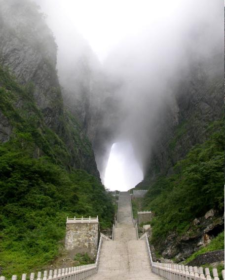 天門山上有一個天門洞,2006年03月,曾有俄羅斯之戰(zhàn)斗機(jī)在此表演飛躍天門洞的表演,還造成滿大的轟動。上天門洞之前,必須先征服999個階梯,經(jīng)過一番努力終于登上天門洞之后,突有豁然的感覺,人在山上,卻仍然在洞中,從這里更可以鳥瞰整個張家界市的景色。用完晚餐后,即乘車從張家界回車長沙。